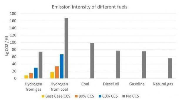 在90% -95%的捕獲率下,以煤和天然氣為基礎(chǔ)的氫比傳統(tǒng)化石燃料的碳強(qiáng)度低得多。但是60%的捕獲率意味著煤制氫的排放強(qiáng)度與直接燃燒天然氣相當(dāng)。