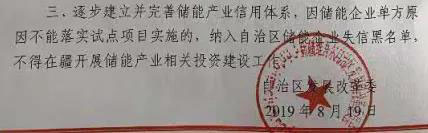新疆方面為規(guī)范市場,基于貫徹政策的嚴肅性,在8月份還出臺了一份補充通知,對單方面不能落實試點項目實施的儲能企業(yè),將拉入失信黑名單,以后不得在新疆開展儲能產(chǎn)業(yè)相關(guān)投資建設(shè)工作。