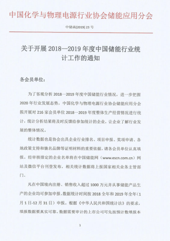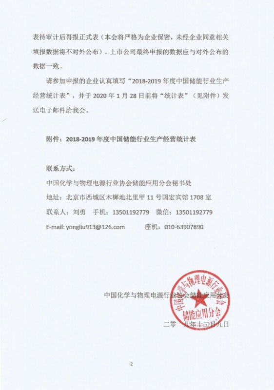 請(qǐng)參加申報(bào)的企業(yè)認(rèn)真填寫“2018-2019年度中國儲(chǔ)能行業(yè)生產(chǎn)經(jīng)營統(tǒng)計(jì)表”,并于2020年1月28日前將“統(tǒng)計(jì)表”(見附件)發(fā)送電子郵件給我會(huì)。