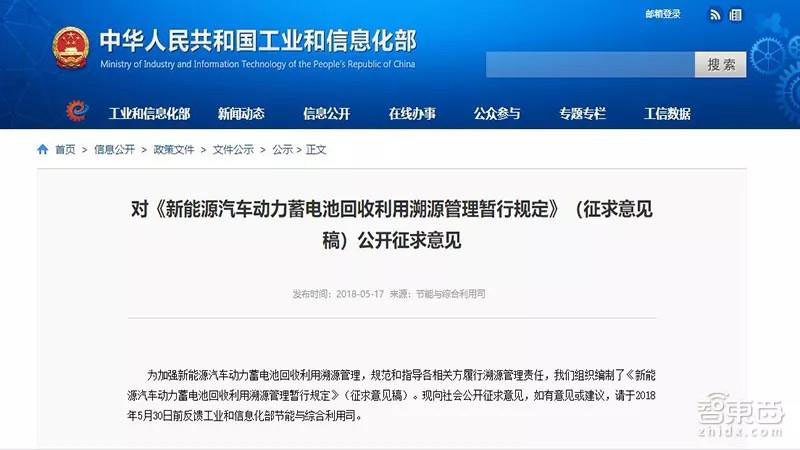 2018年5月17日,為加強(qiáng)新能源汽車動(dòng)力蓄電池回收利用溯源管理,工信部發(fā)布《新能源汽車動(dòng)力蓄電池回收利用溯源管理暫行規(guī)定》(征求意見稿)公開征求意見。