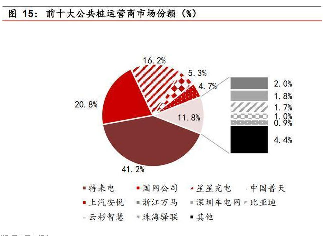 洗牌過后,頭部效應愈發(fā)明顯。廣證恒生充電樁行業(yè)報告顯示,2018年國內(nèi)充電樁市場中,特來電占據(jù)42%,其次是國網(wǎng)的20%、星星充電占據(jù)18%,可以看到,僅頭部的5家企業(yè)就瓜分了90%的蛋糕。