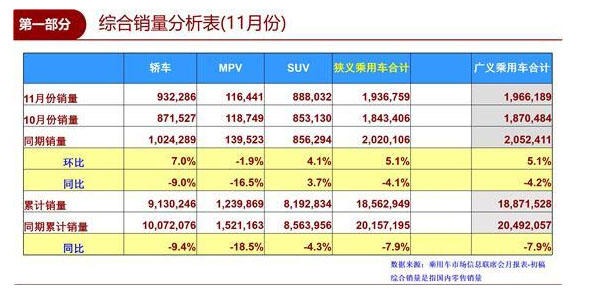 昨日(12月9日),乘用車市場信息聯(lián)席會(以下簡稱“乘聯(lián)會”)發(fā)布數(shù)據(jù)顯示:11月,我國狹義乘用車銷量達到1936759輛,環(huán)比上漲5.1%,同比下滑4.1%,下滑幅度繼續(xù)小幅收窄;推動1-11月累計銷量同比下滑進一步收縮至7.9%,達到18562949輛。