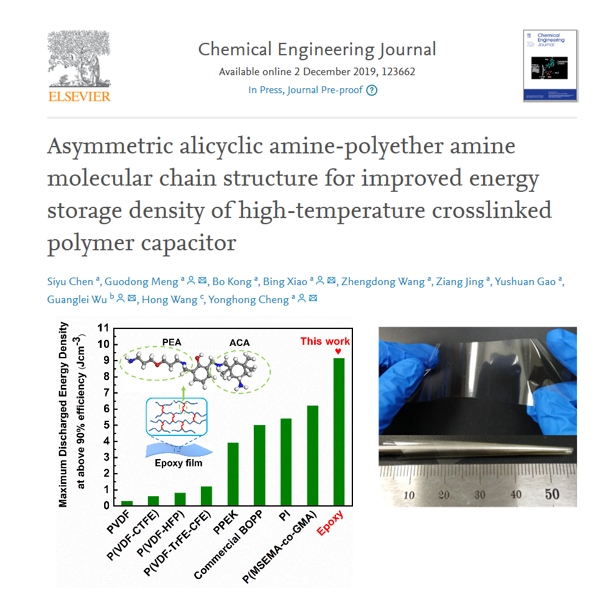 記者9日從西安交通大學(xué)獲悉,該校電力設(shè)備電氣絕緣國家重點實驗室成永紅教授課題組通過研究環(huán)氧樹脂分子結(jié)構(gòu)特征、宏觀電場下極化機制及高溫儲能性能三者的影響作用機制,創(chuàng)新的設(shè)計了非對稱聚醚胺-脂環(huán)胺分子鏈結(jié)構(gòu),合成制出目前儲能密度最大值耐高溫柔性環(huán)氧薄膜,其相關(guān)研究成果以《非對稱脂環(huán)胺-聚醚胺分子鏈結(jié)構(gòu)提高高溫聚合物薄膜電容的儲能密度》為題,近日在國際化學(xué)工程領(lǐng)域頂級期刊《化學(xué)工程》在線發(fā)表。