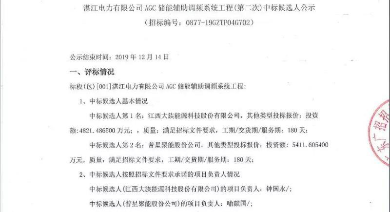 12月11日,湛江電力公司AGC儲(chǔ)能調(diào)頻項(xiàng)目發(fā)布中標(biāo)候選人公示,江西大族能源科技公司成為第一中標(biāo)候選人,其投標(biāo)報(bào)價(jià)約為4821萬元。