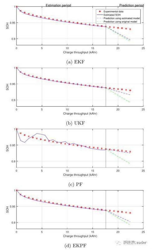 從上述分析可以得知,準(zhǔn)確的估算模型的參數(shù),對(duì)于提高模型預(yù)測(cè)的準(zhǔn)確程度具有十分重要的意義,為了能夠提高在線預(yù)測(cè)的準(zhǔn)確度,Chin-Yao Chang利用了四種方法對(duì)模型參數(shù)進(jìn)行在線估算: 1)擴(kuò)展卡爾曼濾波EKF,2)無(wú)損卡爾曼濾波UKF,3)粒子濾波PF,4)擴(kuò)展卡爾曼粒子濾波EKPF。利用四種方法對(duì)模型參數(shù)進(jìn)行估算,然后利用這些參數(shù)對(duì)單體電池衰降進(jìn)行預(yù)測(cè)的結(jié)果如下圖所示。從圖上可以看到,實(shí)驗(yàn)分為兩個(gè)部分,第一部分是0到17.6kAh,這部分?jǐn)?shù)據(jù)用于對(duì)模型參數(shù)的估算,第二部分是17.6到22.4kAh利用估算的參數(shù)對(duì)單體電池的衰降進(jìn)行預(yù)測(cè)。從結(jié)果上來(lái)看,通過(guò)幾種方法的對(duì)模型的參數(shù)估算后,模型預(yù)測(cè)結(jié)果與實(shí)驗(yàn)結(jié)果之間均方根要明顯小于原始模型的預(yù)測(cè)結(jié)果,這表明使用在線的模型參數(shù)估算可以顯著的提升模型預(yù)測(cè)的準(zhǔn)確程度。