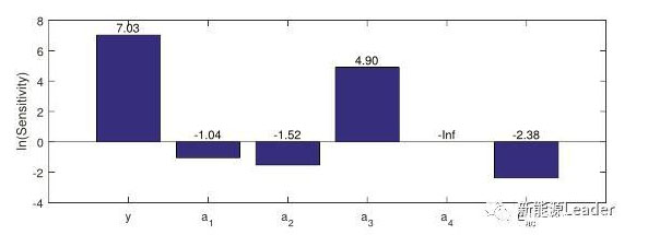 下圖展示了模型對(duì)不同參數(shù)的靈敏度,從圖上可以看到,模型對(duì)y和a3兩個(gè)參數(shù)靈敏度最高,因此這兩個(gè)參數(shù)對(duì)模型預(yù)測(cè)的準(zhǔn)確度影響十分大。