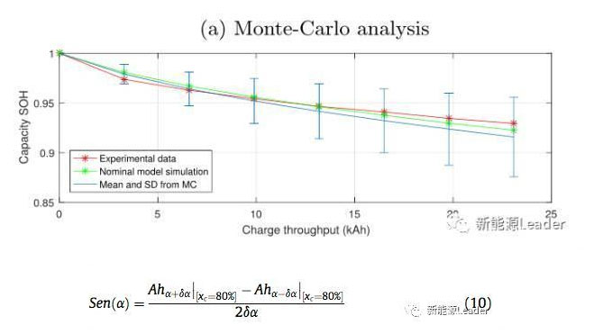 為了驗(yàn)證該模型參數(shù)對(duì)預(yù)測(cè)結(jié)果的影響,Chin-Yao Chang隨機(jī)產(chǎn)生了100個(gè)與普通值偏離度在5%以內(nèi)的模型參數(shù),因此也就產(chǎn)生了100個(gè)模型,將該模型預(yù)測(cè)結(jié)果與實(shí)驗(yàn)值和普通模型預(yù)測(cè)值進(jìn)行了對(duì)比,實(shí)驗(yàn)結(jié)果如下圖所示。從結(jié)果來(lái)看,在長(zhǎng)期預(yù)測(cè)中由于模型參數(shù)微小誤差(5%以內(nèi))造成的誤差在電池循環(huán)過(guò)程中逐漸增大,導(dǎo)致模型預(yù)測(cè)失真。因此需要對(duì)模型參數(shù)進(jìn)行靈敏度分析,靈敏度分析是采用了數(shù)字?jǐn)_動(dòng)方法進(jìn)行的,如下式所示,式中a為衰降模型參數(shù),a為擾動(dòng),Sen為靈敏度度量。