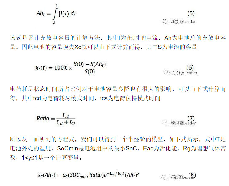 Chin-Yao Chang研究顯示,衰降模型參數(shù)微小的誤差都會(huì)導(dǎo)致模型預(yù)測(cè)結(jié)果與實(shí)際結(jié)構(gòu)之間巨大的誤差,因此對(duì)于電池組衰降模型參數(shù)的估算可以顯著的提升模型的預(yù)測(cè)準(zhǔn)確程度。單體電池的衰降主要取決于電池的溫度、累計(jì)充放電容量、最小SoC、充電倍率、電荷耗盡狀態(tài)時(shí)間和電荷保持時(shí)間等因素,這些參數(shù)可以分別由下式計(jì)算而得。