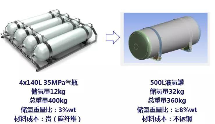 清華大學(xué)團(tuán)隊還開發(fā)了500升液氫儲氫系統(tǒng),目前剛完成液氫與燃料電池發(fā)動機(jī)的聯(lián)調(diào)測試。一個500升的液氫罐可以存儲32公斤的液氫,換算成70MPa儲氫概要用五到六個瓶子,在體積與重量方面液氫有非常大的優(yōu)勢。