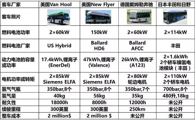 近年來,燃料電池客車示范運(yùn)營大幅推動了燃料電池技術(shù)的發(fā)展與應(yīng)用。下圖比較了國外典型的城市客車燃料電池系統(tǒng),對標(biāo)國際一流水平,目前中國已掌握了100千瓦級大功率發(fā)動機(jī)制造技術(shù)與動力系統(tǒng)設(shè)計技術(shù),建有國際上最大的燃料電池客車車隊,氫耗、成本等關(guān)鍵指標(biāo)在國際上處于領(lǐng)先水平。