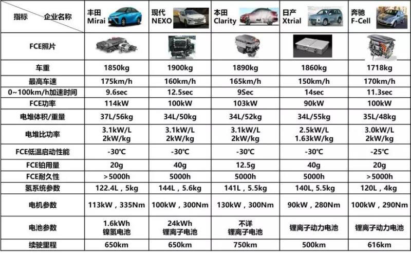 當(dāng)前,從國內(nèi)外發(fā)展情況看,國際上主要的整車企業(yè)都在進(jìn)行燃料電池轎車開發(fā)。表1是目前已經(jīng)發(fā)布燃料電池轎車的主要參數(shù),其中最具代表性的是豐田Mirai,總產(chǎn)量已超過10000臺,它將會在2020年東京奧運(yùn)會上進(jìn)行示范。此外,在2018年平倉奧運(yùn)會上,現(xiàn)代的NEXO也進(jìn)行了小規(guī)模示范,取得了很好效果。除了圖1所提到的企業(yè),寶馬也宣稱明年將推出燃料電池跑車。針對乘用車空間緊湊的特點,目前已發(fā)布的燃料電池轎車的動力系統(tǒng)集成度不斷提高。例如本田、奔馳所開發(fā)的燃料電池系統(tǒng),已經(jīng)可以在空間上直接替代傳統(tǒng)內(nèi)燃機(jī)。