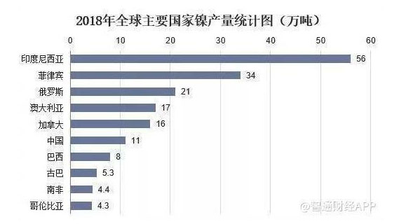 另外值得注意的是國家是菲律賓。盡管菲律賓的儲量(480萬噸)位列全球第六,但2018年該國卻以34萬噸的產(chǎn)量位居第二。此外,澳大利亞鎳儲量位居第二(1900萬噸),但產(chǎn)量卻排在第六位,2018年僅為16萬噸。