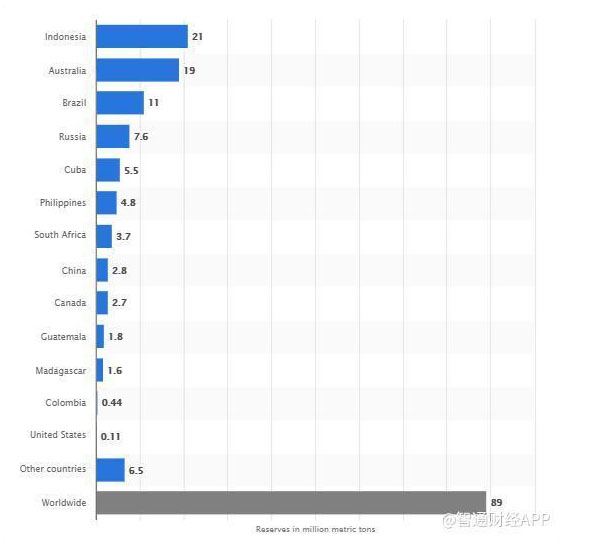 在產(chǎn)業(yè)鏈上游中,紅土鎳礦對應(yīng)成分為氧化鎳,全球儲量占比60%;硫化礦對應(yīng)成分為硫化鎳,占比40%。根據(jù)Statista數(shù)據(jù),2018年全球鎳儲量約為8900萬噸。其中,印度尼西亞儲量位居第一,達(dá)2100萬噸,占比約24%,是鎳資源最豐富的國家。澳大利亞、巴西、俄羅斯、古巴、菲律賓分別排名2-6位。中國的鎳儲量為280萬噸,位居第八。