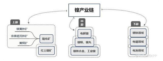 鎳產(chǎn)業(yè)鏈的上游為鎳礦資源,分為紅土鎳礦和硫化礦兩類。硫化礦還可細(xì)分為鎳黃鐵礦、含鎳磁流鐵礦、黃銅礦。產(chǎn)業(yè)鏈的中游主要是含鎳中間產(chǎn)品,主要有電解鎳、鎳粉、鎳丸、鎳鐵合金、工業(yè)鎳等。下游則是其它應(yīng)用產(chǎn)業(yè),如鋼鐵、電鍍、電池領(lǐng)域等。