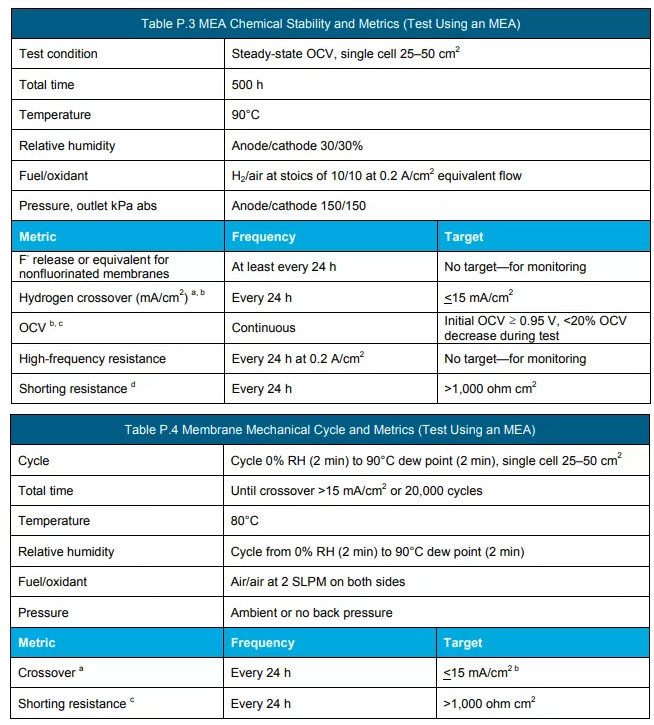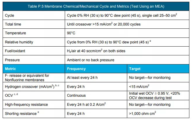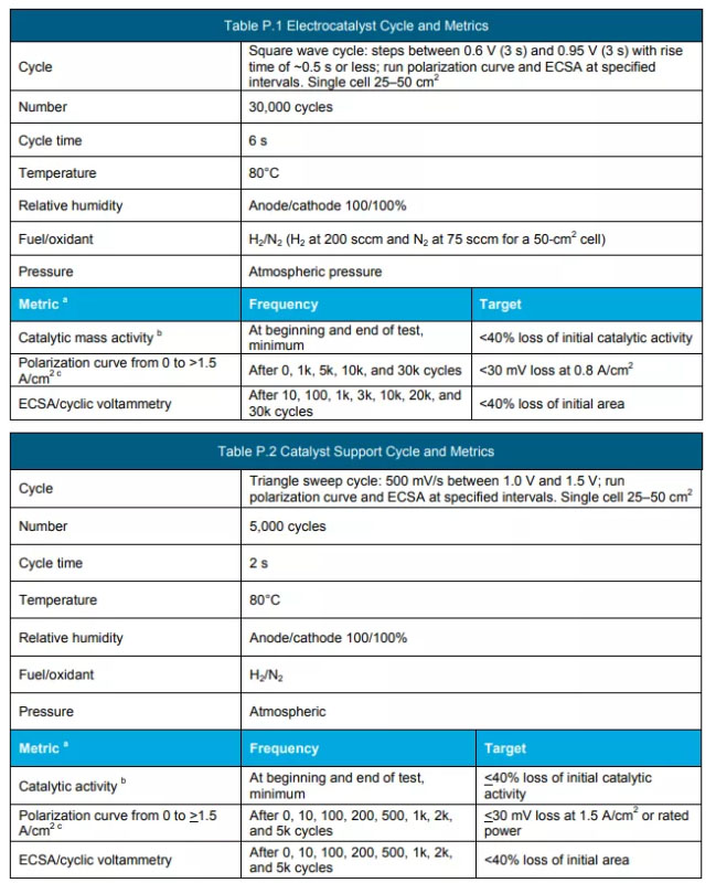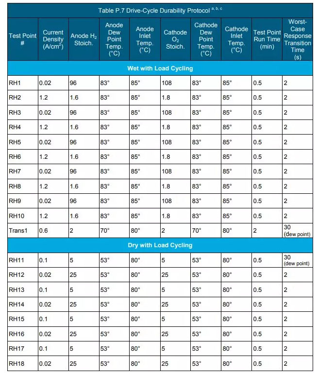 h 使用表P.6中的極化曲線協(xié)議進(jìn)行測量,但可以使用任何溫度到最高工作溫度的溫度范圍,最大入口RH為40%。額定功率工作點(diǎn)和電催化劑技術(shù)目標(biāo)的注釋b相同。
