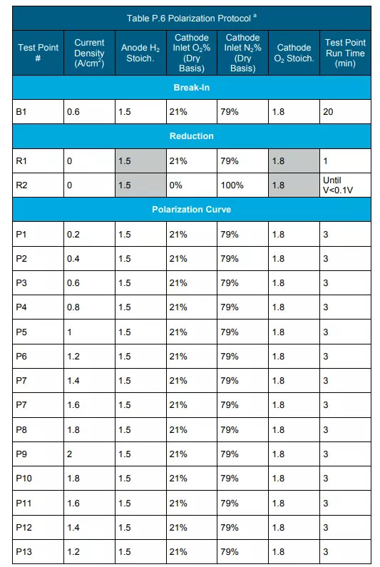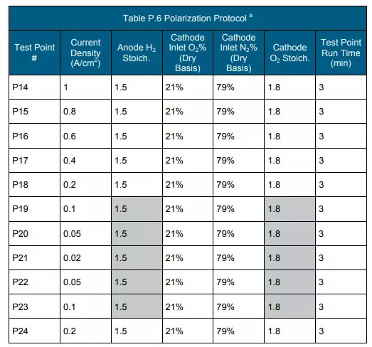 l 使用基于表P.6中極化曲線協(xié)議下測量的1.0 A/cm2電密運(yùn)行下90°C時(shí)電壓與80°C時(shí)電壓之比。露點(diǎn)溫度59°C用于90°C和80°C溫度操作。
