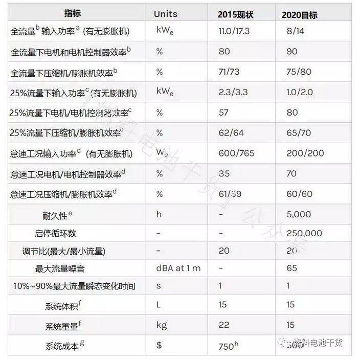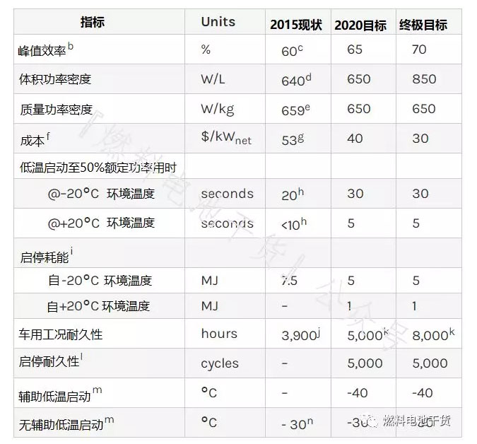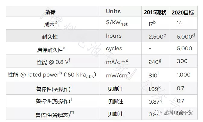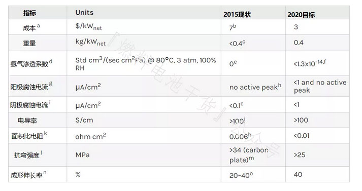 作為美國能源部能效與可再生能源辦公室的下屬部門,燃料電池技術(shù)部門的”多年研究、開發(fā)和示范項(xiàng)目“(Multi-Year Research, Development and Demonstration Plan)指明了有關(guān)燃料電池所有活動(dòng)的目標(biāo)、目的、技術(shù)目標(biāo)、任務(wù)和時(shí)間表。其中,針對交通領(lǐng)域車用質(zhì)子交換膜燃料電池,該項(xiàng)目文件顯示了至2020年質(zhì)子膜、電催化劑、膜電極、雙極板、電堆、加濕器、空壓機(jī)和燃料系統(tǒng)的技術(shù)目標(biāo)。