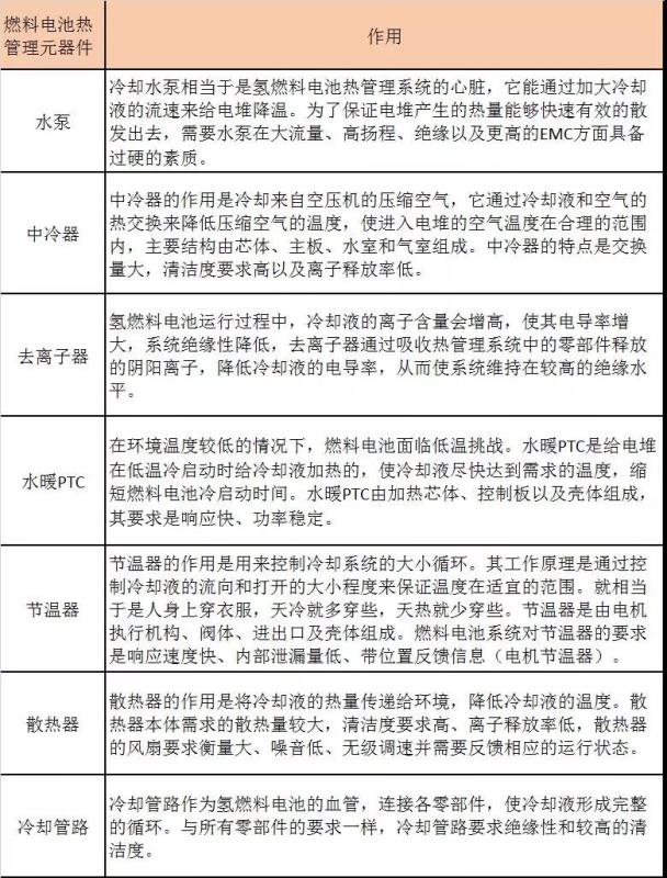 氫燃料電池的熱管理系統(tǒng)將電堆反應(yīng)生成的熱量排出系統(tǒng)外,使電堆維持在適合的溫度區(qū)間工作。事實(shí)上,燃料電池?zé)峁芾硐到y(tǒng)主要包括燃料電池?zé)峁芾恚ㄈ剂想姵乇倔w)和動(dòng)力系統(tǒng)平臺(tái)熱管理兩部分。從燃料電池系統(tǒng)熱管理的元器件組成來(lái)看,又主要由水泵、節(jié)溫器、去離子器、中冷器、水暖PTC、冷卻模塊及冷卻管路等不同部分組成。