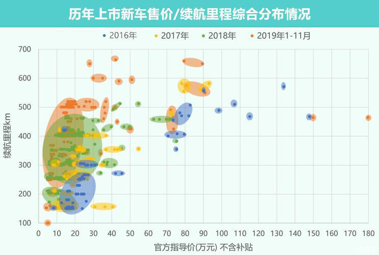 此外,雖然補貼逐年退坡,但從指導價和續(xù)航里程分布情況來看,新車的性價比正在不斷的升級。越來越多的新車在續(xù)航里程不斷突破新高的同時,指導價卻不斷下探。隨著技術的不斷發(fā)展,供應鏈的不斷成熟,當純電動車在成本和核心要素都能與燃油車持平時,其產品競爭力將會充分展現出來。