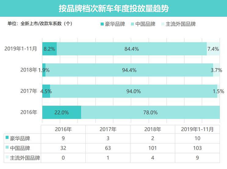 從車型級別維度看,2016年至今,新產品類型越來越多樣化。其中,2019年1-11月緊湊級轎車和小型SUV的推新數量同比明顯增長,成為了當下的主流級別。MPV正在悄然興起,并且不斷發(fā)展中,未來有望成為一個新的高增長區(qū)域,畢竟消費者已經開始對六/七座車型有了越來越旺盛的需求,這點在傳統能源市場中已經有了驗證。