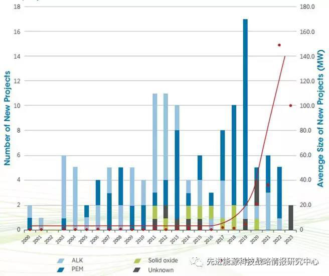 圖1 2000-2023年全球新增電解制氫項(xiàng)目變化態(tài)勢(shì)(左軸:項(xiàng)目數(shù)量;右軸:新項(xiàng)目平均規(guī)模<兆瓦>)
