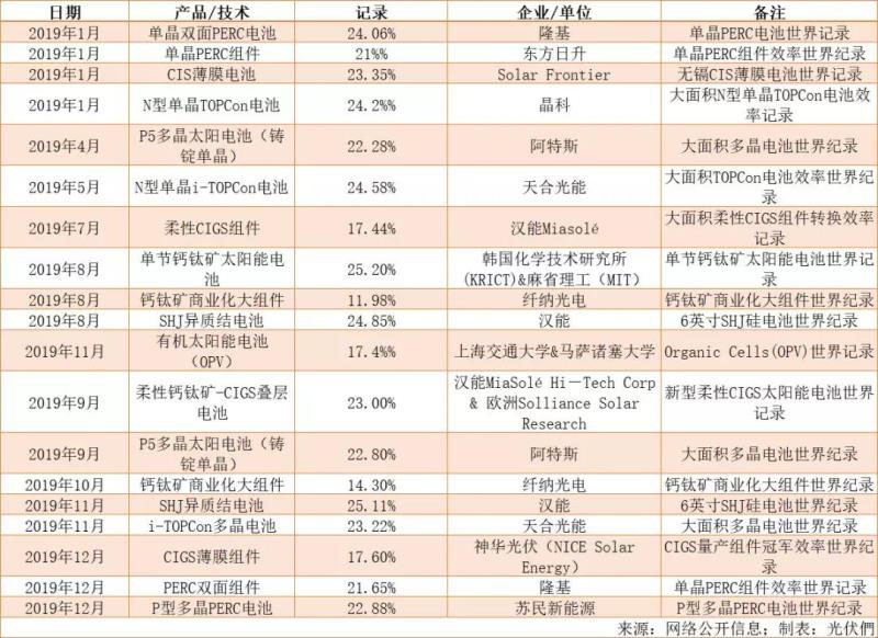 除了產(chǎn)業(yè)化的技術(shù)外,各企業(yè)研發(fā)單位、科研機(jī)構(gòu)等研發(fā)的腳步也從未停止。根據(jù)光伏們不完全統(tǒng)計(jì),2019年電池組件至少創(chuàng)造20項(xiàng)以上的世界效率記錄,既包括已成為市場(chǎng)主流的PERC產(chǎn)品,也包括異質(zhì)結(jié)、TOPCon、鈣鈦礦等尚未大規(guī)模產(chǎn)業(yè)化的前沿技術(shù)。