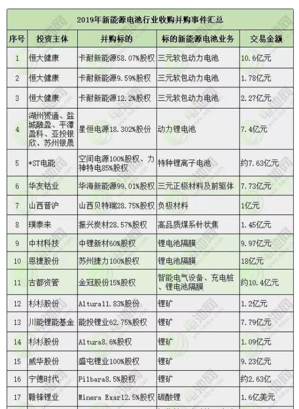 據(jù)電池網(wǎng)不完全統(tǒng)計,2017年新能源電池行業(yè)最終宣告失敗的案例有10起左右,2018年也超過14起,2019年僅6起:大洋電機(jī)終止收購上海重塑部分股權(quán)、科恒股份終止收購譽(yù)辰自動化100%股權(quán)和誠捷智能100%股權(quán)、華友鈷業(yè)放棄并購巴莫科技、愛康科技終止收購鑫成泰、八菱科技終止收購宇量電池、中利集團(tuán)終止收購比克動力。