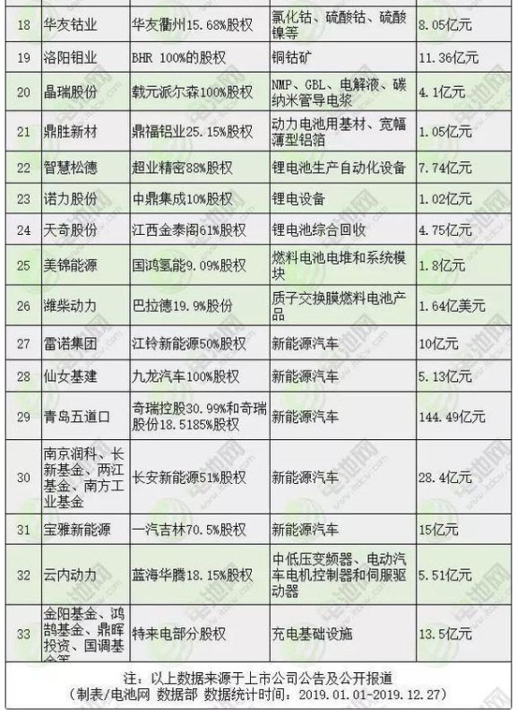 經(jīng)電池網(wǎng)不完全統(tǒng)計,2019年在新能源電池領(lǐng)域,交易金額超1億元的收購并購事件有33個,總金額約384.29億元,平均交易金額11.65億元。其中,被收購并購的企業(yè)中,鋰電池企業(yè)有5家,正極材料企業(yè)1家,負(fù)極材料企業(yè)2家,隔膜企業(yè)3家,礦產(chǎn)資源企業(yè)8家,電解液企業(yè)1家,鋁箔企業(yè)1家,設(shè)備企業(yè)2家,電池回收企業(yè)1家;燃料電池企業(yè)2家;新能源汽車企業(yè)5家,電控企業(yè)1家,充電基礎(chǔ)設(shè)施企業(yè)1家。