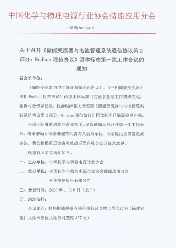 關(guān)于召開(kāi)《儲(chǔ)能變流器與電池管理系統(tǒng)通信協(xié)議第2部分:Modbus通信協(xié)議》團(tuán)體標(biāo)準(zhǔn)第一次工作會(huì)議的通知
