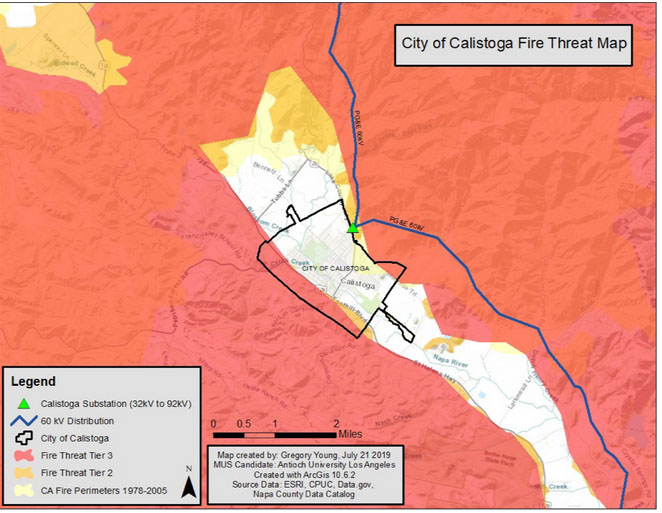 加利福尼亞州有一些地區(qū)已經(jīng)為電力中斷做準(zhǔn)備。例如,加利福尼亞州卡利斯托加市已要求清潔聯(lián)盟進(jìn)行可行性分析,以開(kāi)發(fā)社區(qū)微電網(wǎng),并作為管理和應(yīng)用加利福尼亞在火災(zāi)高發(fā)季度停電(PSPS)的一種潛在工具。下圖是太平洋天然氣和電力公司(PG&E)發(fā)布的城市火災(zāi)威脅圖,并指出接到城市的60kV電力線(xiàn)具有被森林火災(zāi)影響的風(fēng)險(xiǎn)。