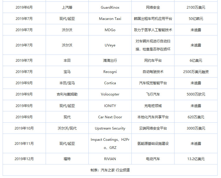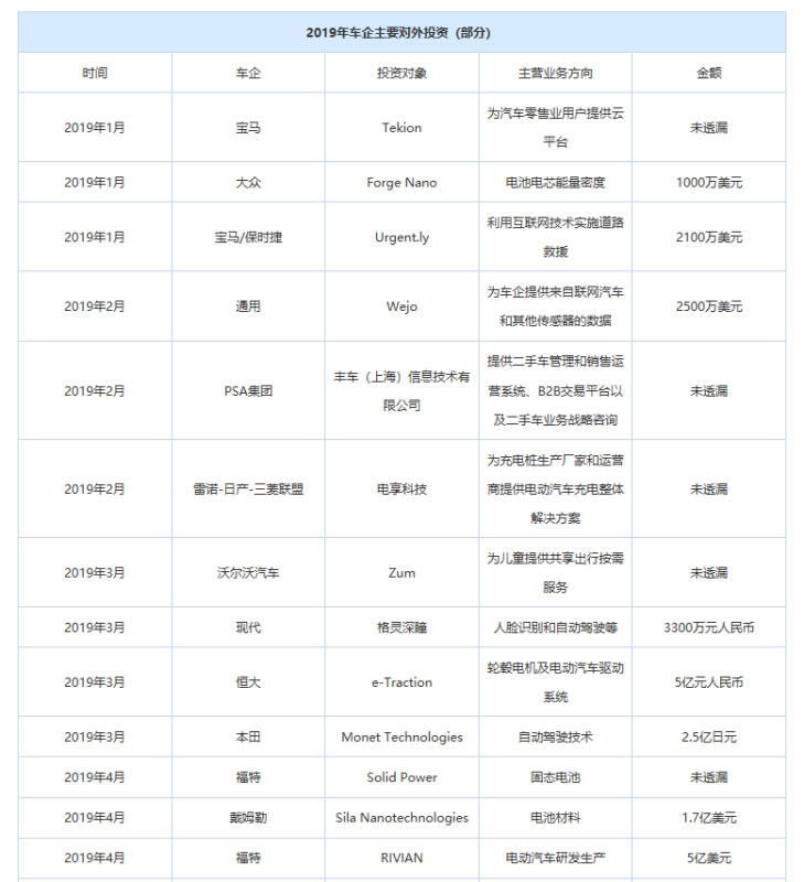 汽車銷量下行、電動化加劇之際,汽車企業(yè)對外投資也發(fā)生了變化。今年以來,我們很少聽到車企大規(guī)模、數(shù)十億美元的對外投入,更多是的“大眾計劃投資超4600億加速電動化轉型”“現(xiàn)代汽車預留3620億布局新技術”等自我修煉“內(nèi)功”的聲音傳出。不過,從“零星”的車企對外投資項目,我們也能看出企業(yè)未來布局方向。