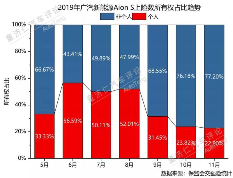 根據(jù)上險數(shù)的統(tǒng)計,自6月后,Aion S非個人所有權(quán)比例逐月上升,至10月后已經(jīng)占比近八成。如果按照銷售總量簡單估算,Aion S每月實(shí)際銷售給個人的數(shù)量基本也在1,000-2,000輛之間,與幾何A、秦Pro EV基本相當(dāng)。