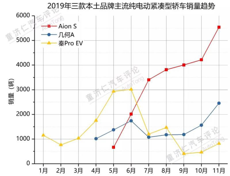 不難看出,官方統(tǒng)計口徑中,整體市場中個人購買新能源汽車的比例大約在50%-60%的水平。那么,如果再具體到家用消費(fèi)最主流的細(xì)分市場——緊湊型轎車市場,情況是否會有變化?今年前11個月,三款本土品牌主流純電動緊湊型轎車——廣汽新能源Aion S、吉利幾何A、比亞迪秦Pro EV的銷量走勢也許能說明問題。