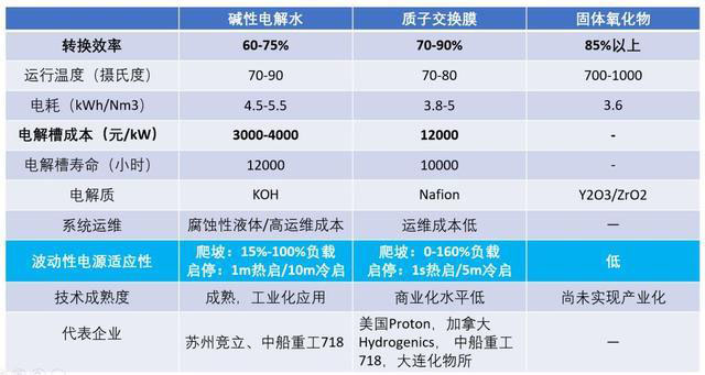 目前電解制氫技術(shù)的主要方案還是電解水,可分為三類:堿性電解水、質(zhì)子交換膜和固體氧化物。其中固體氧化物制氫的技術(shù)水平相對來說還是比較初步,產(chǎn)業(yè)化的距離還是還是比較遠,所以目前主要聚焦的還是堿性電解水和質(zhì)子交換膜,反映這兩類技術(shù)核心的差異點包括轉(zhuǎn)換效率、電解槽成本和波動性電源適應(yīng)性。質(zhì)子交換膜在轉(zhuǎn)換效率更高,堿性電解水在電解槽成本更低。但是未來的一個核心關(guān)鍵點在于如何更多地采用低價的可再生能源來制氫,因此波動性電源適應(yīng)性是非常重要的因素。那從這個角度來看的話,質(zhì)子交換膜在在爬坡和啟停上的靈活性會高一些 。