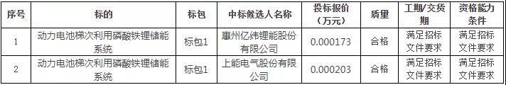 據(jù)此前報(bào)道,億緯鋰能曾中標(biāo)動(dòng)力電池梯次利用磷酸鐵鋰儲(chǔ)能系統(tǒng),其投標(biāo)報(bào)價(jià)為1.73元/Wh,一起參與投標(biāo)的另一候選人為上海電氣,其投標(biāo)價(jià)格2.03元/Wh。