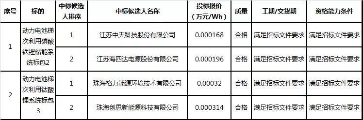 動(dòng)力電池梯次利用儲(chǔ)能系統(tǒng)框架招標(biāo)公告顯示,擬采購(gòu)磷酸鐵鋰儲(chǔ)能系統(tǒng)和動(dòng)力電池梯次利用鈦酸鋰儲(chǔ)能系統(tǒng),江蘇中天科技股份有限公司以1.68元/Wh中標(biāo)第二標(biāo)包(磷酸鐵鋰儲(chǔ)能系統(tǒng)),另外第二候選人江蘇海四達(dá)電源的投標(biāo)價(jià)格為1.96元/Wh;而珠海格力能源環(huán)境技術(shù)有限公司以3.2元/Wh中標(biāo)第三標(biāo)包(鈦酸鋰儲(chǔ)能系統(tǒng)),第二候選人珠海創(chuàng)思新能源3.14元/Wh。