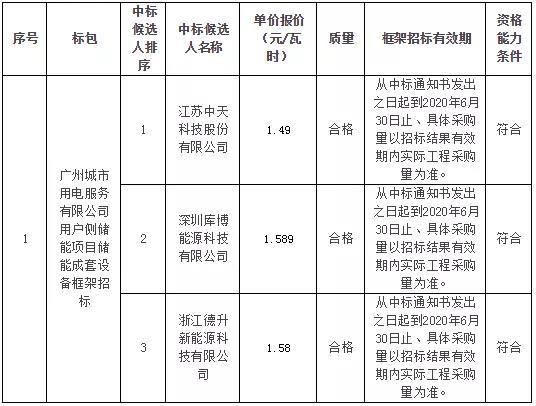 廣州城市用電公司2MW/4MWh用戶側(cè)儲(chǔ)能項(xiàng)目設(shè)備框架中標(biāo)結(jié)果中,江蘇中天科技股份有限公司為第一候選人,報(bào)價(jià)價(jià)格為1.49元/Wh,第二候選人為深圳庫(kù)博能源科技有限公司,其投標(biāo)價(jià)格為1.589/Wh,第三候選人為浙江德升新能源科技有限公司,投標(biāo)價(jià)格為1.58元/Wh。據(jù)了解,該招標(biāo)此前公示預(yù)計(jì)采購(gòu)單價(jià)為1.59元/Wh。