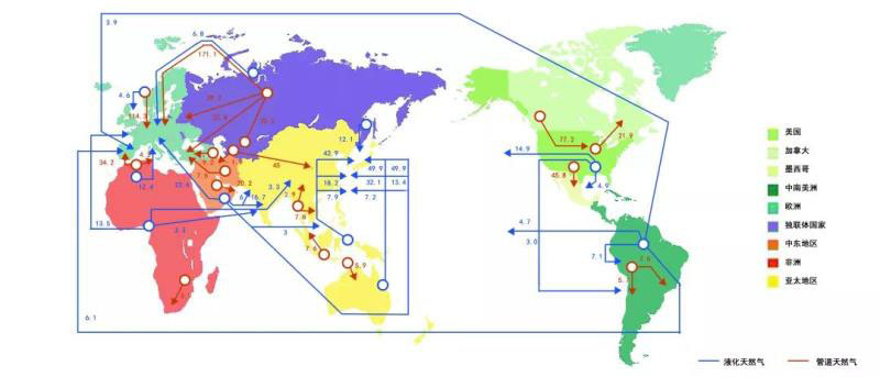 2018年天然氣主要貿(mào)易流向(單位:十億立方米) 來源:BP公司 2019年《世界能源統(tǒng)計年鑒》