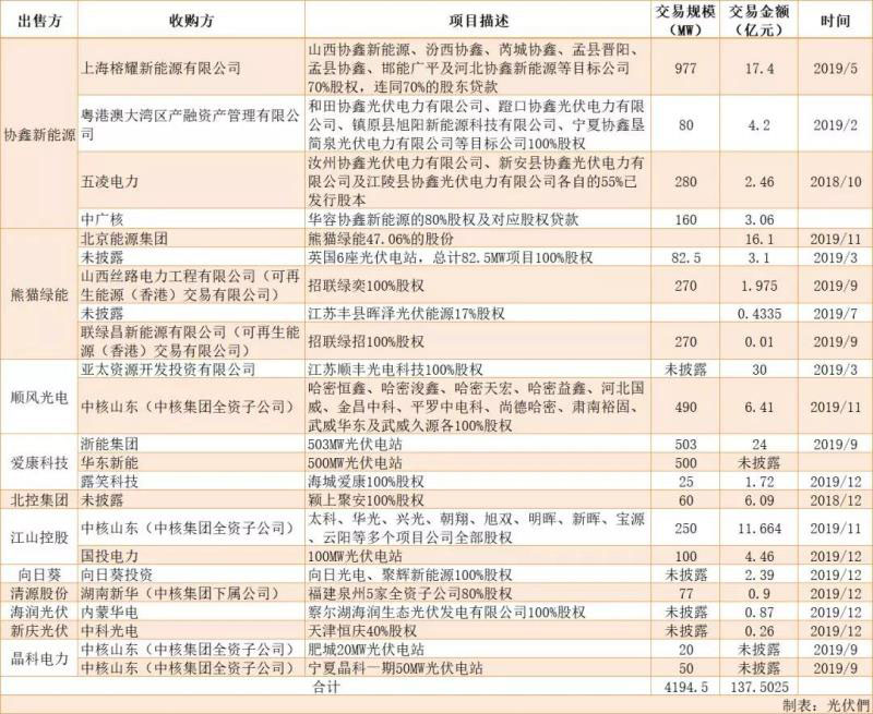 光伏們梳理了2019年的光伏電站資產(chǎn)交易信息,據(jù)不完全統(tǒng)計(jì),2019年有超過4GW光伏電站進(jìn)行出售,交易金額近140億元。