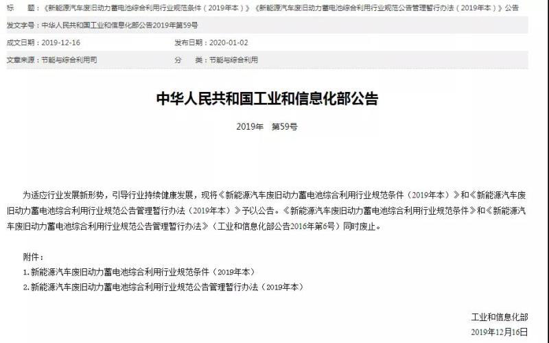 在動力電池大規(guī)模退役潮到來之際,近日,工信部正式發(fā)布了《新能源汽車廢舊動力蓄電池綜合利用行業(yè)規(guī)范條件(2019年本)》(簡稱《規(guī)范條件》)和《新能源汽車廢舊動力蓄電池綜合利用行業(yè)規(guī)范公告管理暫行辦法(2019年本)》,此前在2016年公布的《新能源汽車廢舊動力蓄電池綜合利用行業(yè)規(guī)范條件》和《新能源汽車廢舊動力蓄電池綜合利用行業(yè)規(guī)范公告管理暫行辦法》(工業(yè)和信息化部公告2016年第6號)同時廢止。