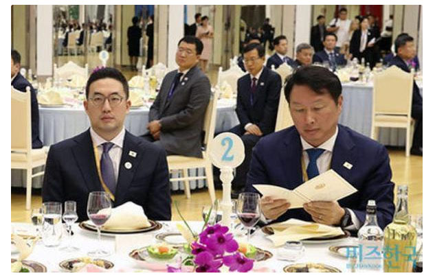 2018年朝韓首腦會議,左邊為LG會長具光謨,右邊為SK會長崔泰源