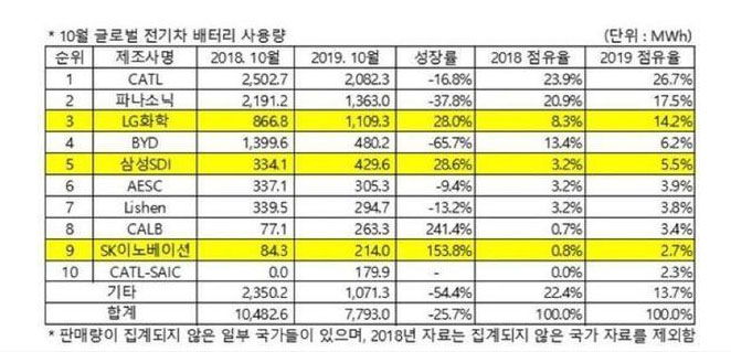 韓國人不無嘲諷的表示,根據(jù)SNE研究的報告,2019年10月,全球EV電池裝機(jī)量與去年同期相比,下降了25.7%,但是韓國的三家公司均實(shí)現(xiàn)了大幅度的正增長。(其中排在第8名的中航鋰電也實(shí)現(xiàn)了大幅增長,但是韓國人視為雜音,選擇無視。)