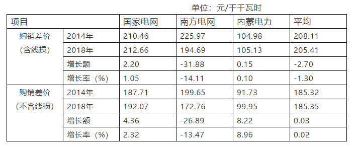 2、扣除線損,電網(wǎng)企業(yè)平均購銷差價2014年為185.32元/千千瓦時,2018年為185.35元/千千瓦時,增長0.02%;