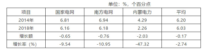 電網(wǎng)企業(yè)平均線損率,2014年為6.20%,2018 年為6.03%,降低了0.17個百分點,平均下降2.74%。
