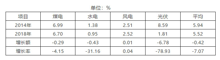 全國發(fā)電企業(yè)平均綜合廠用電率,2014年5.94%(由2015年報告中的“2015年為5.90%,同比下降0.6%”的數(shù)據(jù)反推得知),2018年為5.52%,下降7.07%。