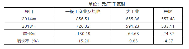 從分類銷售電價看,與2014年相比,2018年的一般工商業(yè)及其他用電平均電價下降15.2%,大工業(yè)用電平均電價下降9.85%,居民用電類別平均電價(到戶價)下降4.37%。