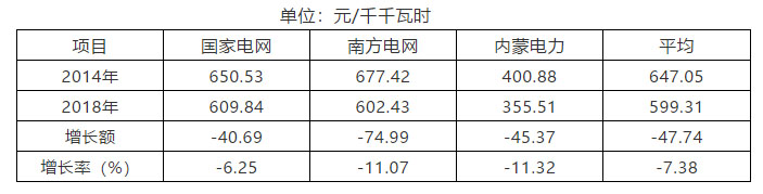 電網(wǎng)企業(yè)平均銷售電價(含稅),2014年為647.05元/千千瓦時,2018年為 599.31 元/千千瓦時,下降7.38%。