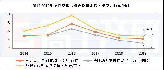 從市場規(guī)模來看,2019年電解液市場產(chǎn)值仍有提升,但毛利率進(jìn)一步降低,市場整體呈出現(xiàn)“增量不增值”。主要原因為電解液價格持續(xù)下降造成,其中動力電解液價格下降對整個電解液行業(yè)均價影響最大。