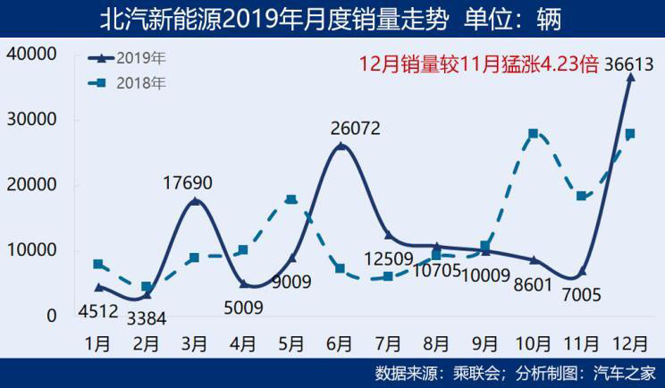 原本在盛夏既已“入冬”的新能源車市,卻于真正的隆冬中突現(xiàn) “陽(yáng)春”,12月銷量止跌回升,環(huán)比大漲52.3%,收于13.83萬(wàn)輛,并且成為2019年度銷量最高的月份。