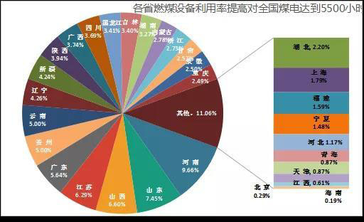 圖3只是將各省煤電平均利用小時數(shù)多少進行了排序,但沒有考慮煤電裝機容量大小因素,一些省的煤電利用小時很低但煤電裝機容量也不大,即便提高到5500小時對提高全國煤電平均利用小時數(shù)分擔作用也不大。為此將煤電裝機容量因素與利用小時數(shù)加權(quán)平均后做成各省對全國煤電平均利用小時提高到5500的分擔率排序餅狀圖(見圖4)